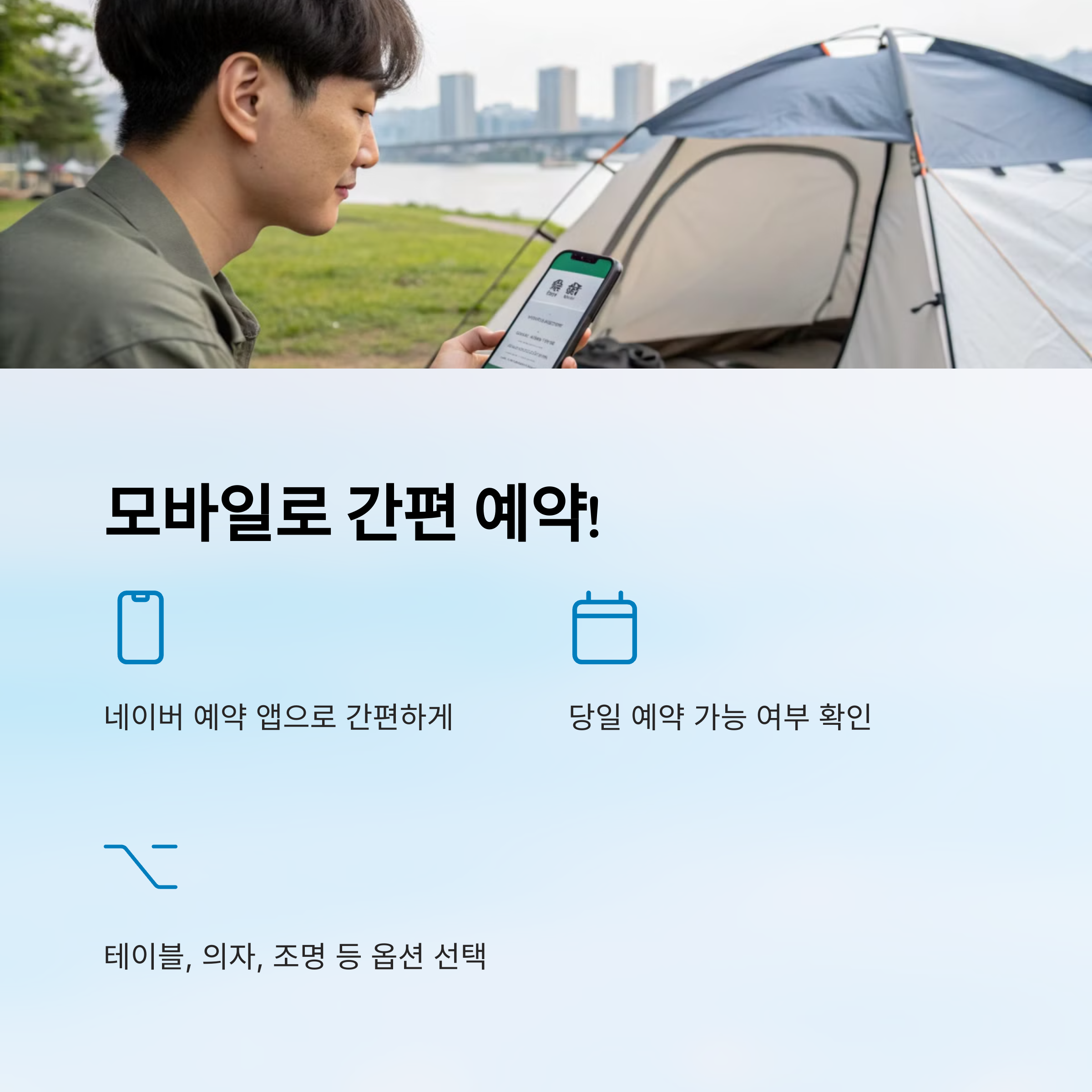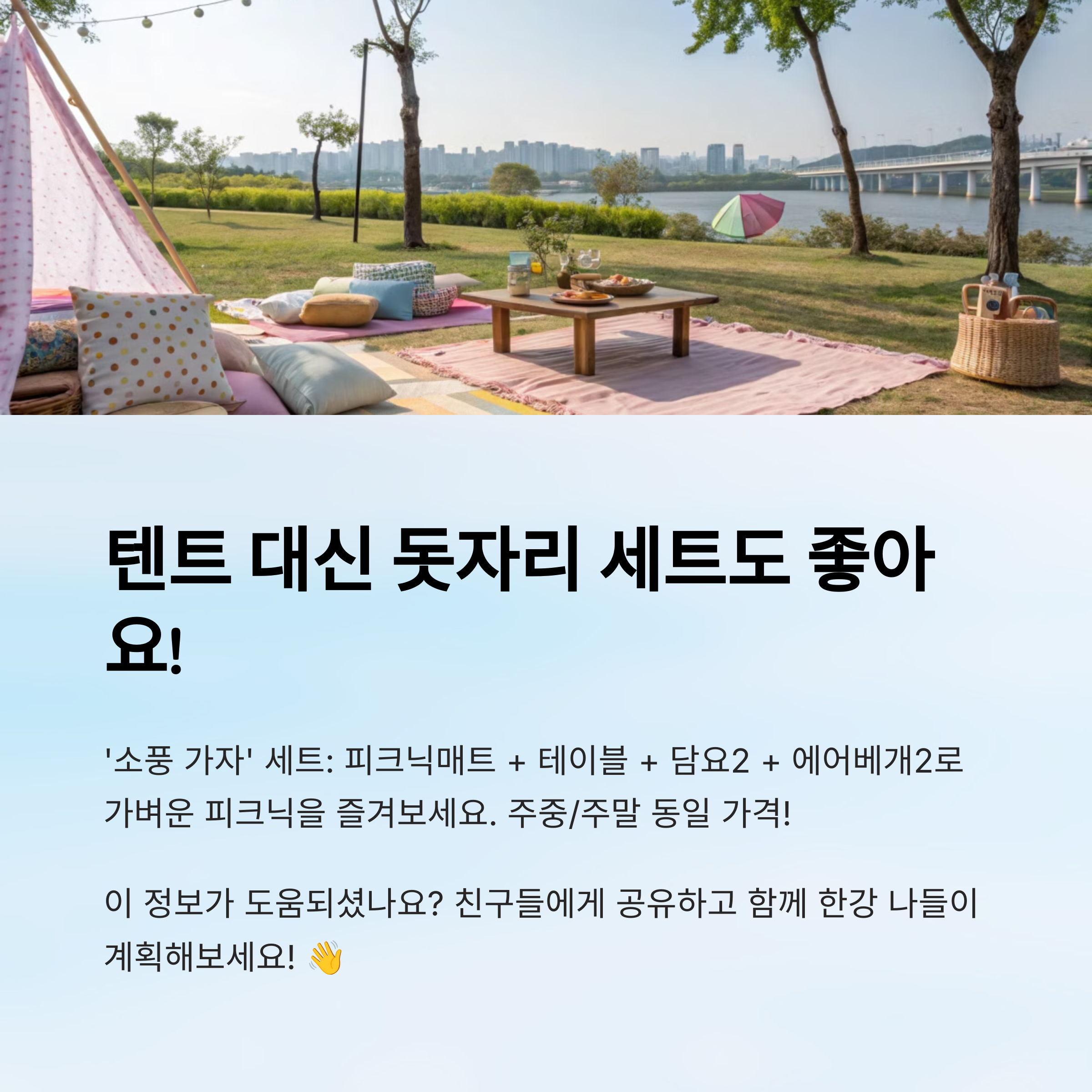 따뜻한 햇살 아래, 시원한 강바람을 맞으며, 편안한 텐트 안에서 즐기는 한강의 여유! 이번 주말에는 뚝섬 한강공원에서 소중한 사람들과 함께 특별한 추억을 만들어보는 건 어떨까요? 모두 즐거운 한강 나들이 되시길 바랍니다!