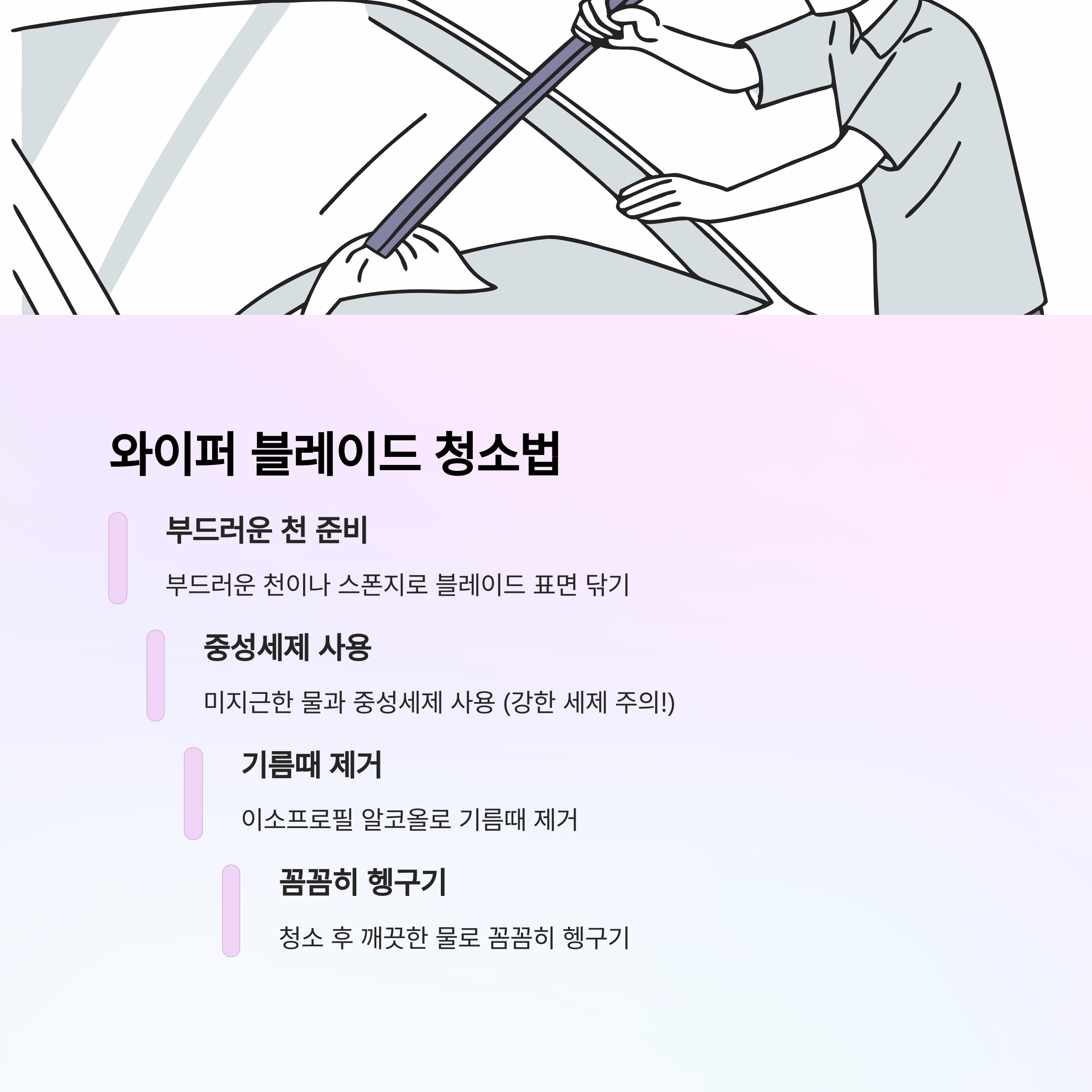 | 기본 청소 | 2주마다 | 물과 중성세제로 와이퍼 고무 닦기 | 일상적인 먼지와 오염물 제거 |