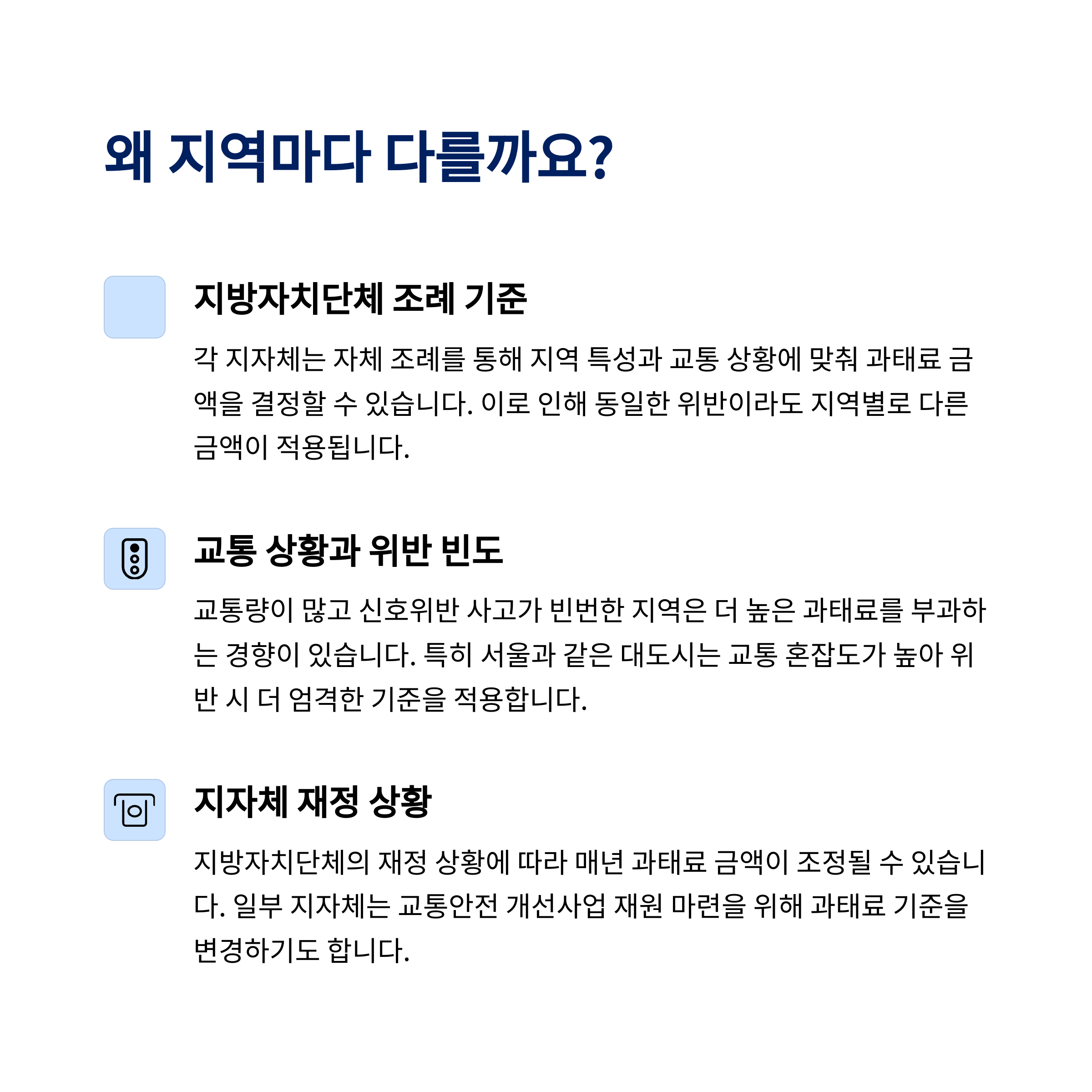2. 지역 특성 반영 - 각 지역의 교통사고 발생률, 인구밀도, 교통 인프라 상황에 따라 과태료가 조정됩니다.