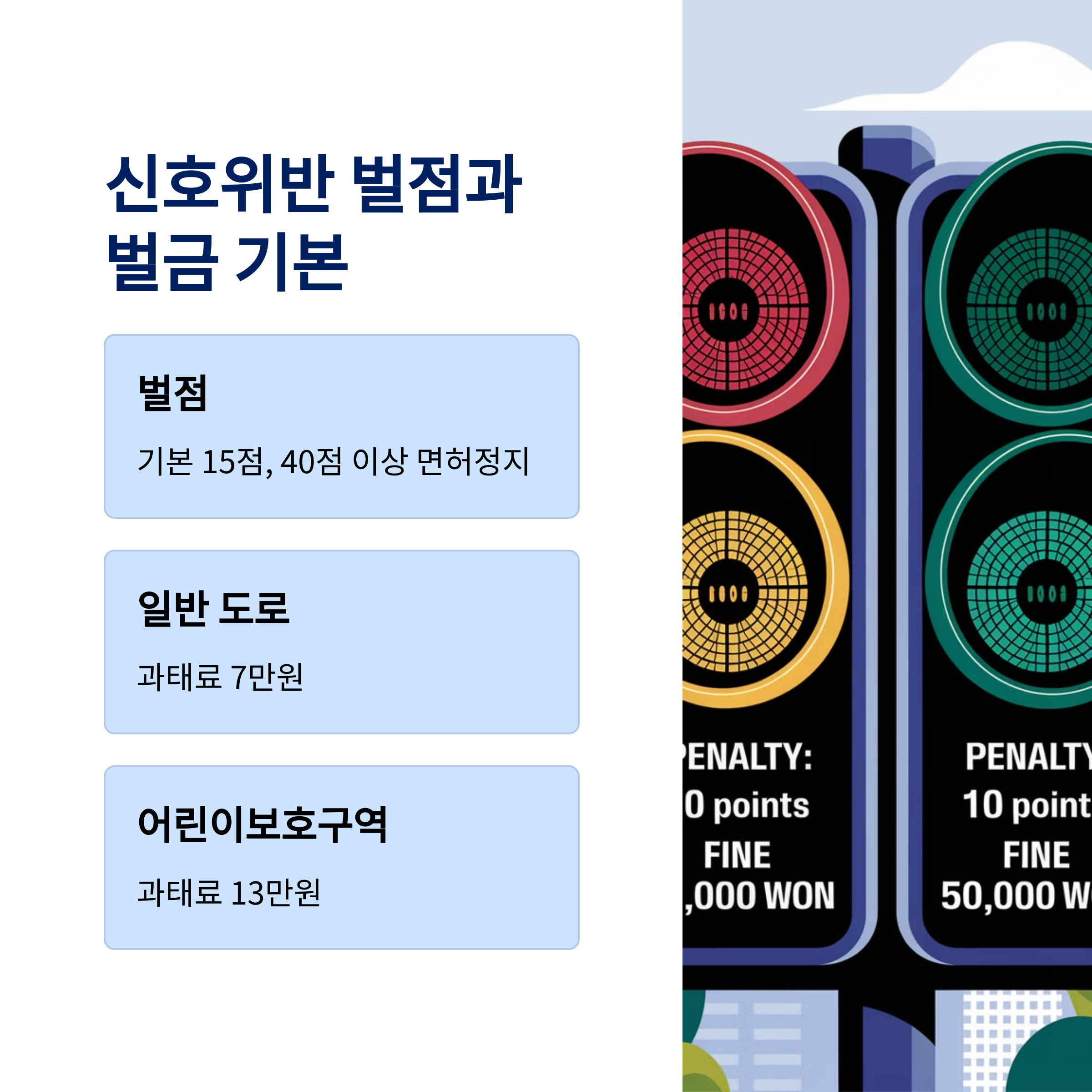 신호위반은 기본적으로 벌점 15점이 부과됩니다. 다만 상황에 따라 조금씩 달라질 수 있어요. 예를 들어 어린이 보호구역에서 신호위반을 하면 벌점이 더 높아지기도 하죠. 다들 알다시피 운전면허는