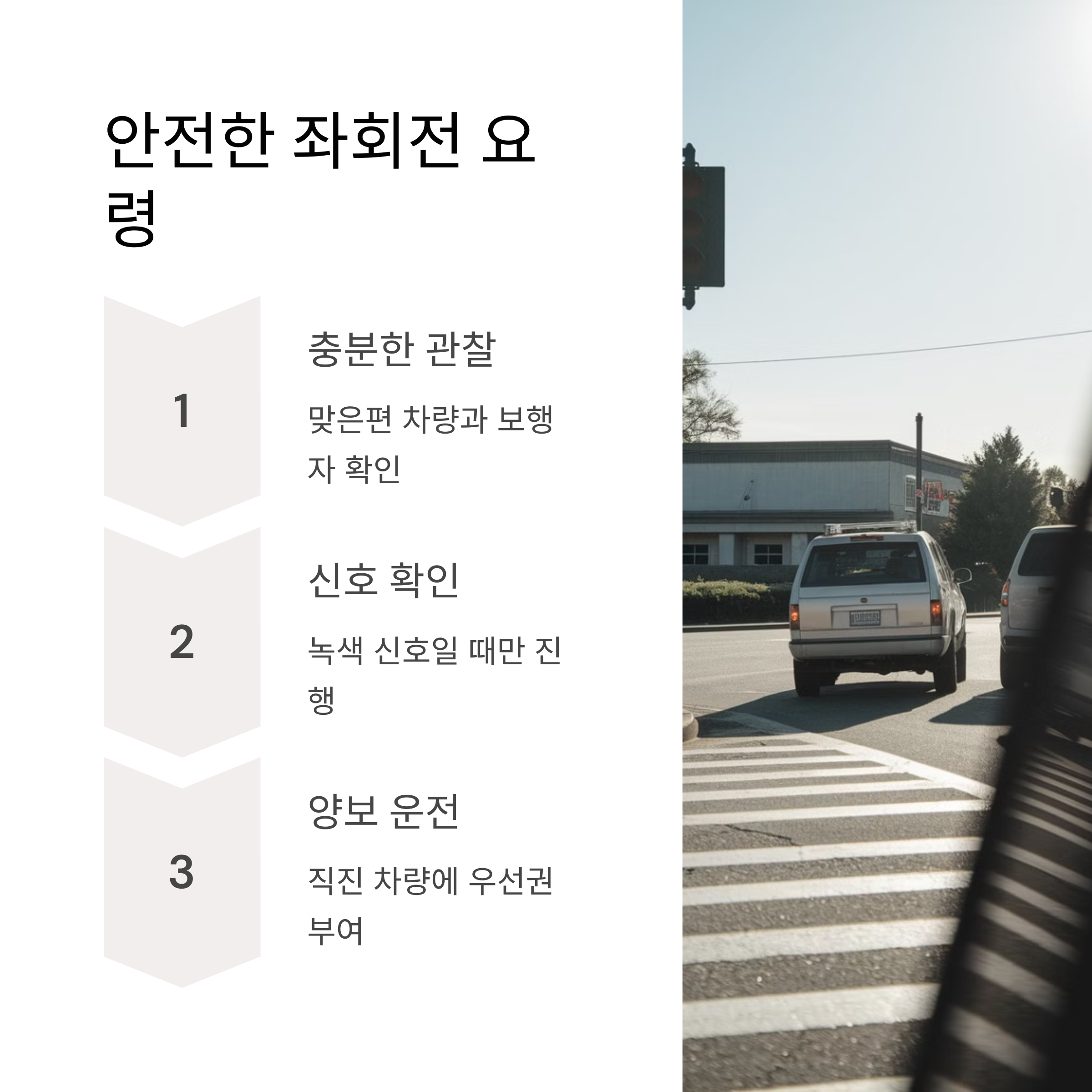 💡 TIP: 교차로 접근 시 맞은편 차량과의 위치 및 신호 타이밍을 미리 파악하세요. 급하게 판단하지 말고 여유를 가지세요!