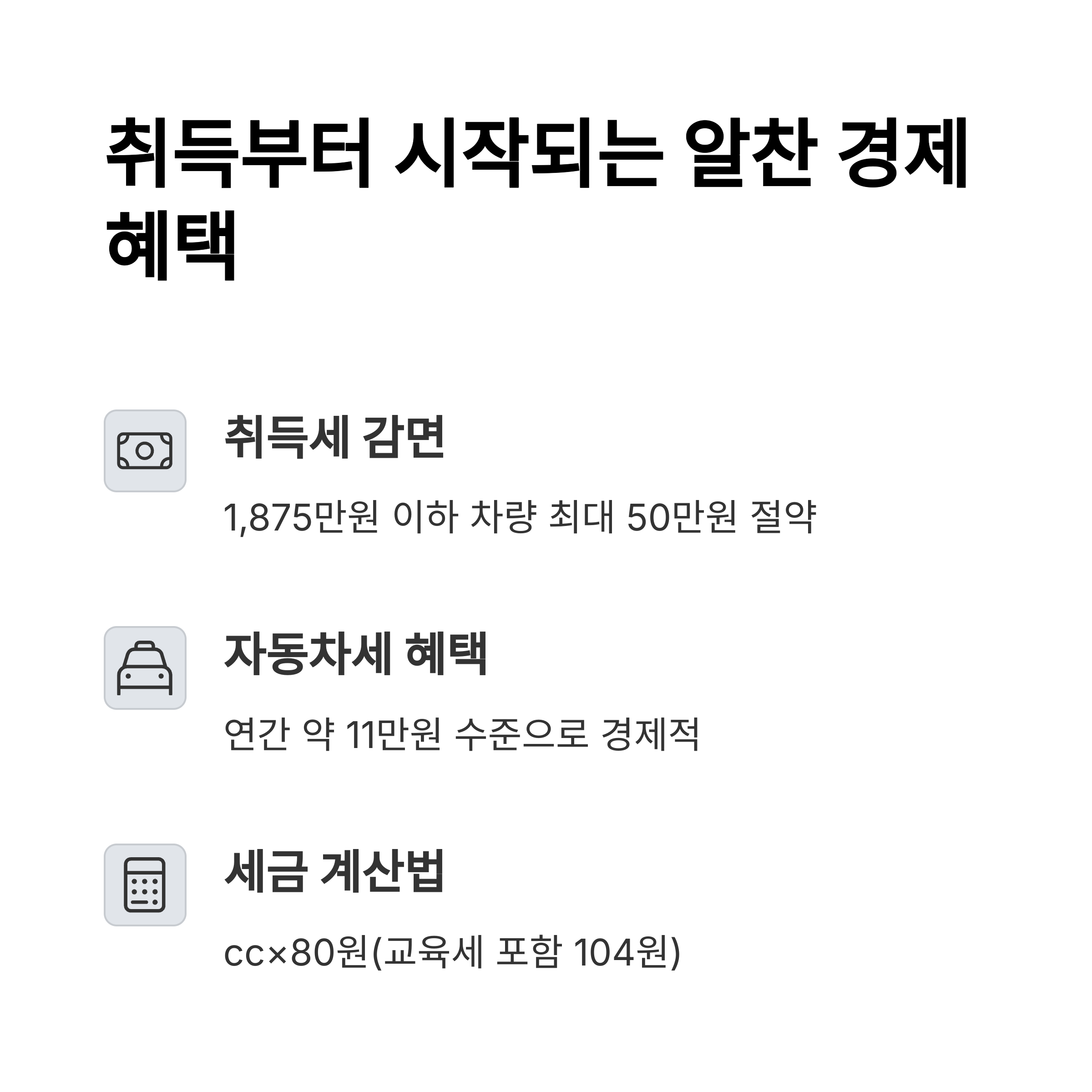 💡 EXPERT TIP: 경차의 혜택은 차량 구매 후 초기 과정이 중요합니다! 혜택 조건에 맞는 차량 성능과 등록 절차를 미리 점검해 초기 혜택을 놓치지 마세요.