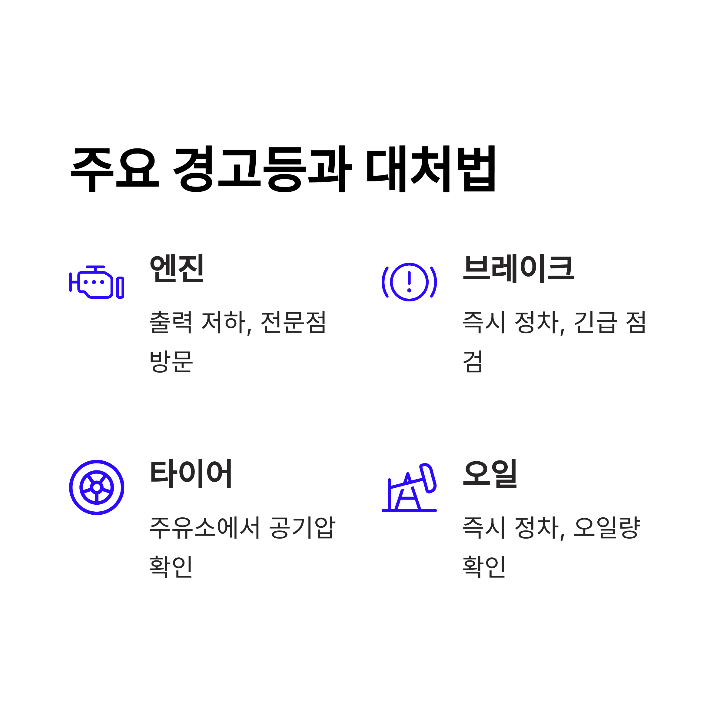 💡 TIP: 계기판 경고등이 켜질 경우, 차를 즉시 정차하거나 가까운 정비소에 문의하는 것이 가장 안전합니다. 특히 빨간색 경고등은 운행을 멈추고 즉각 조치를 취해야 합니다!