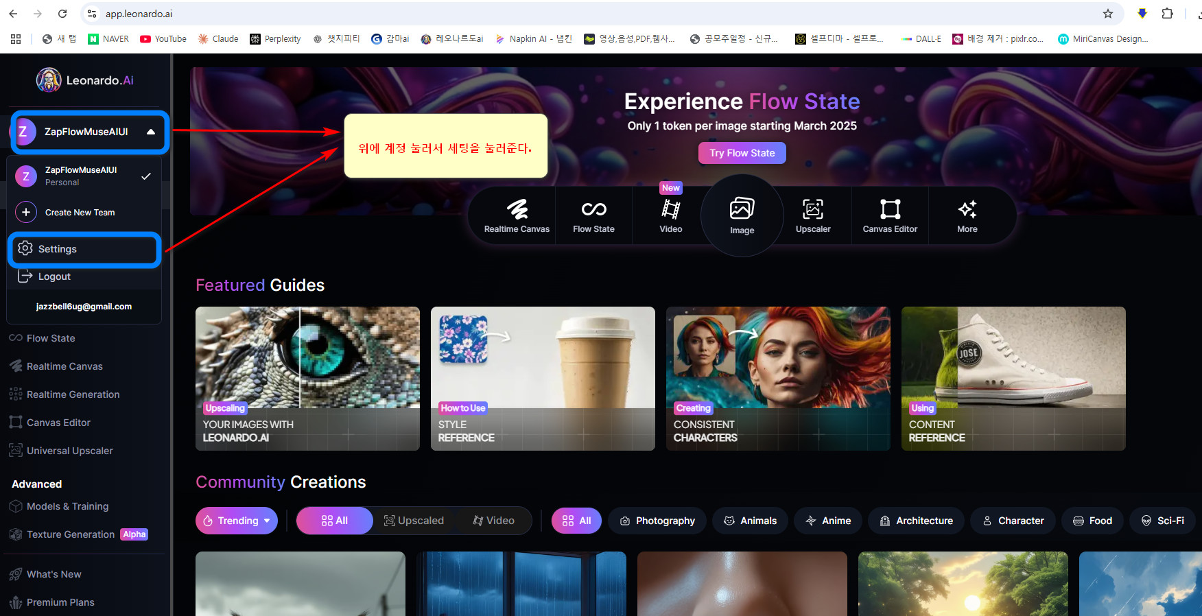 아래의 이미지 처럼 Leonardo ai 에 로그인 한후 왼쪽 상단에 본인의 계정을 누른 후 세팅을 눌러 줍니다.