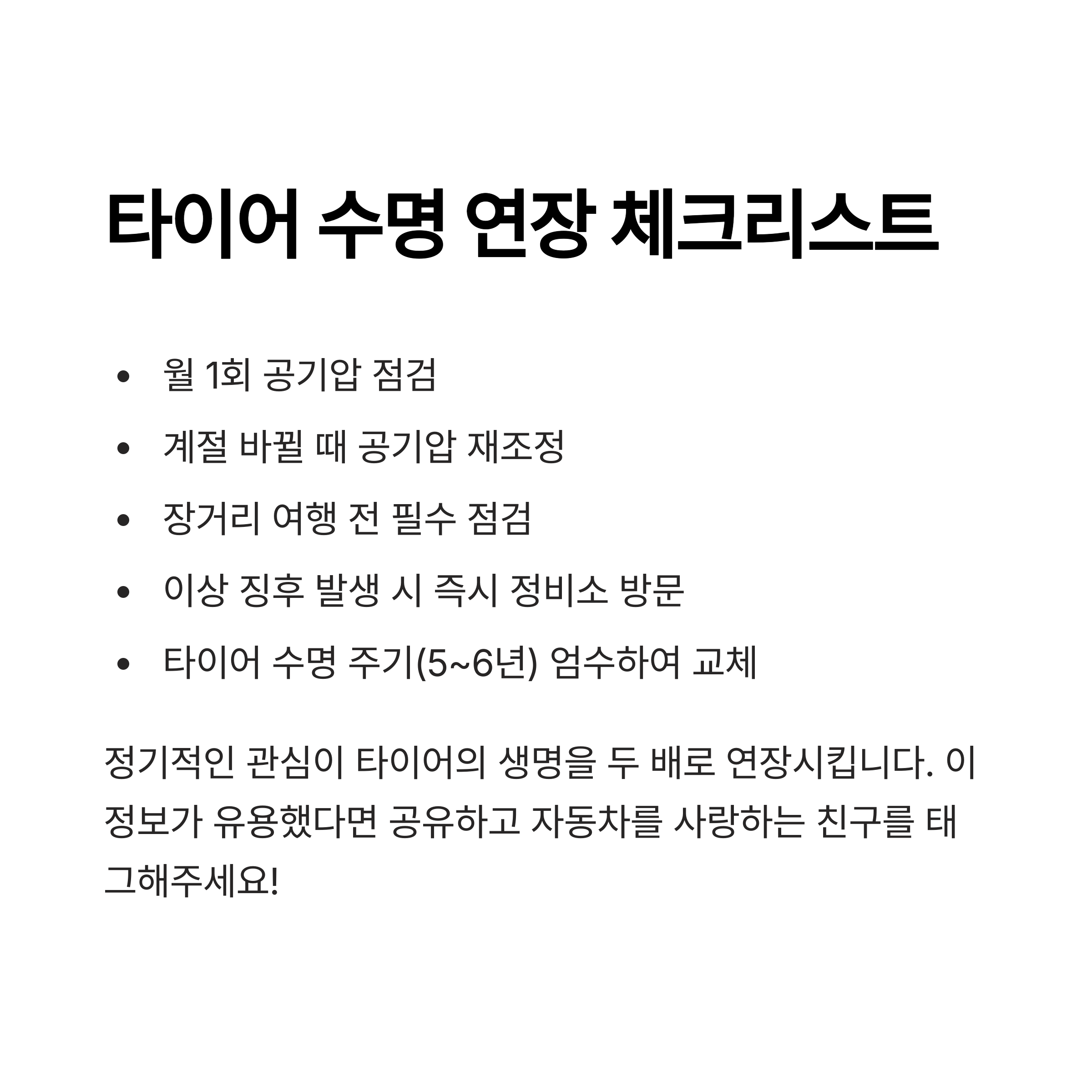 - 이상 징후(진동, 소음, 쏠림) 발생 시 즉시 정비소 방문