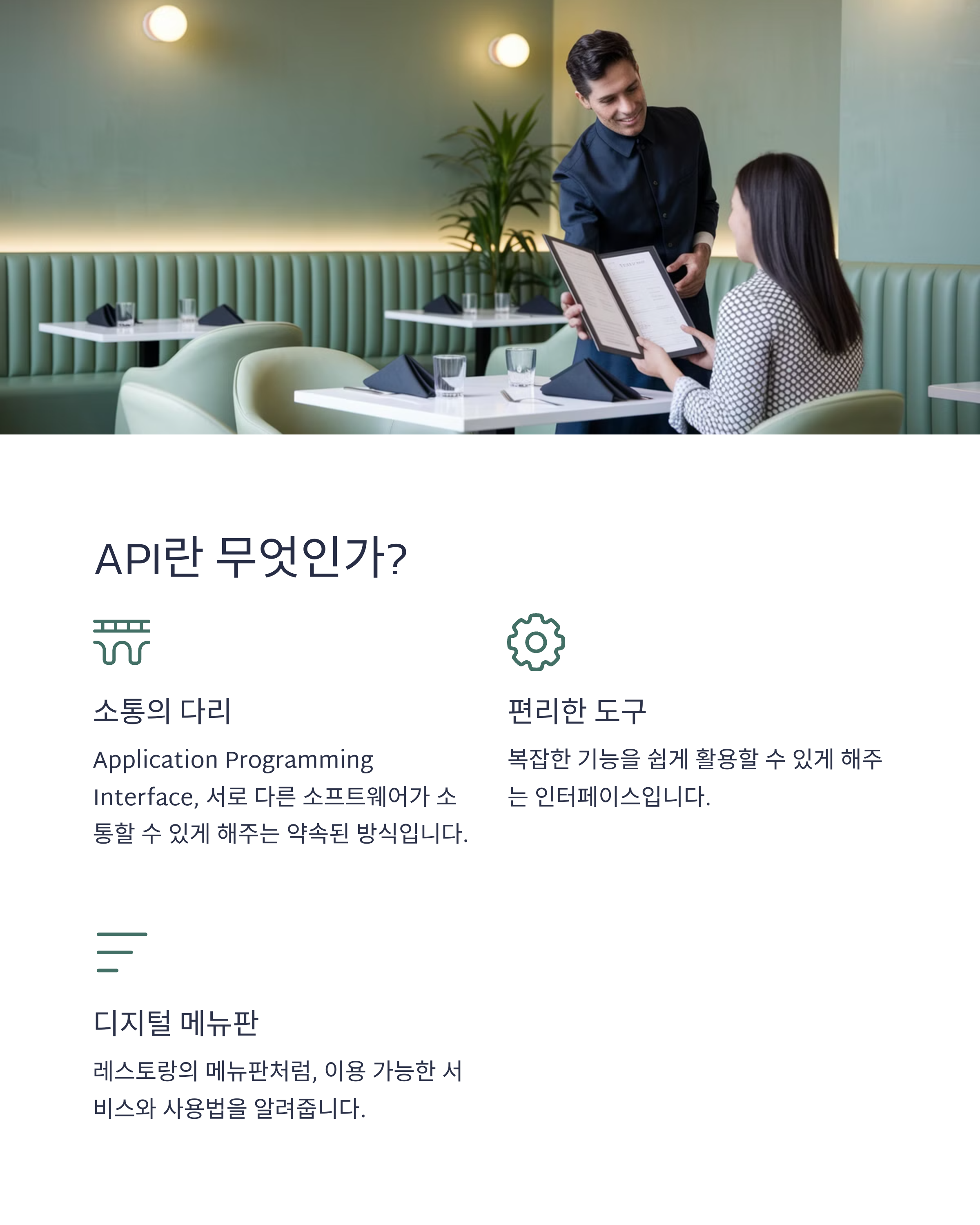 API(Application Programming Interface)라는 말, 너무 어렵게 들리죠? 하지만 실제로는 우리 일상에서 자주 접하는 개념이에요. 쉽게 설명하자면, API는 서로 다른 프로그램이나 시스템이 대화하는 방법이라고 생각하면 됩니다. 마치 음식점에서 손님과 주방 사이의 웨이터 같은 존재예요.