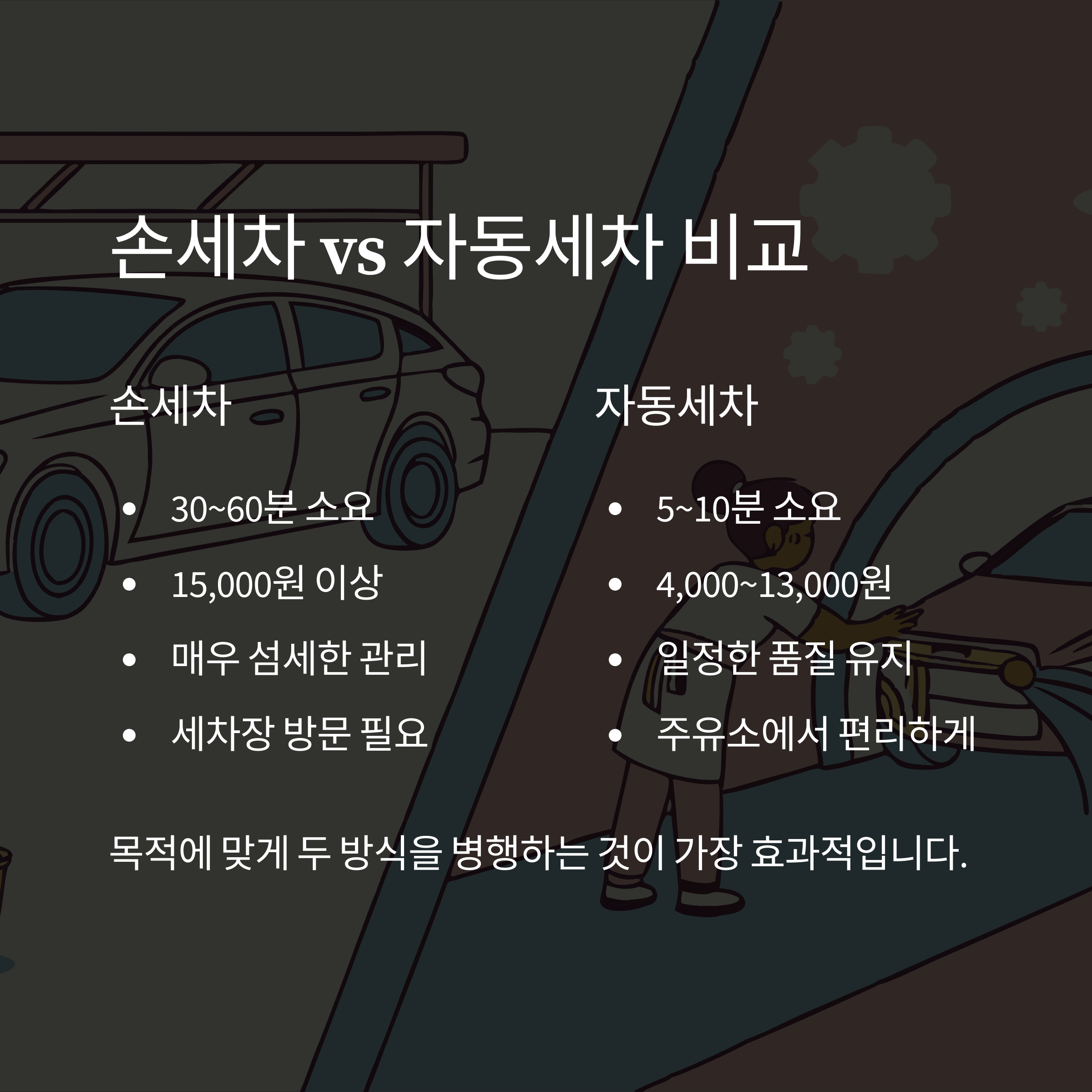 자동 세차는 시간 대비 효율성과 접근성이 뛰어난 반면, 손세차는 세밀한 관리가 가능합니다.