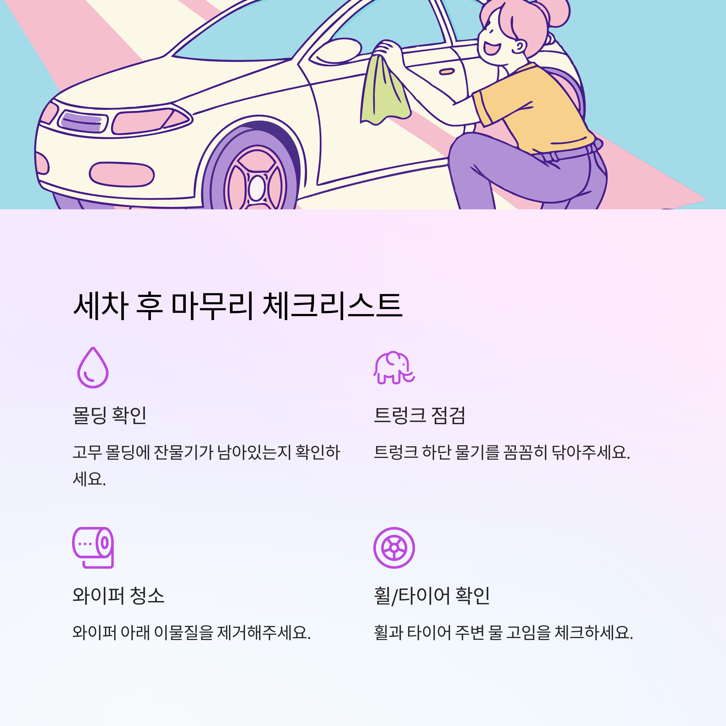 - 세차 후 물기 닦을 마른 수건 미리 준비