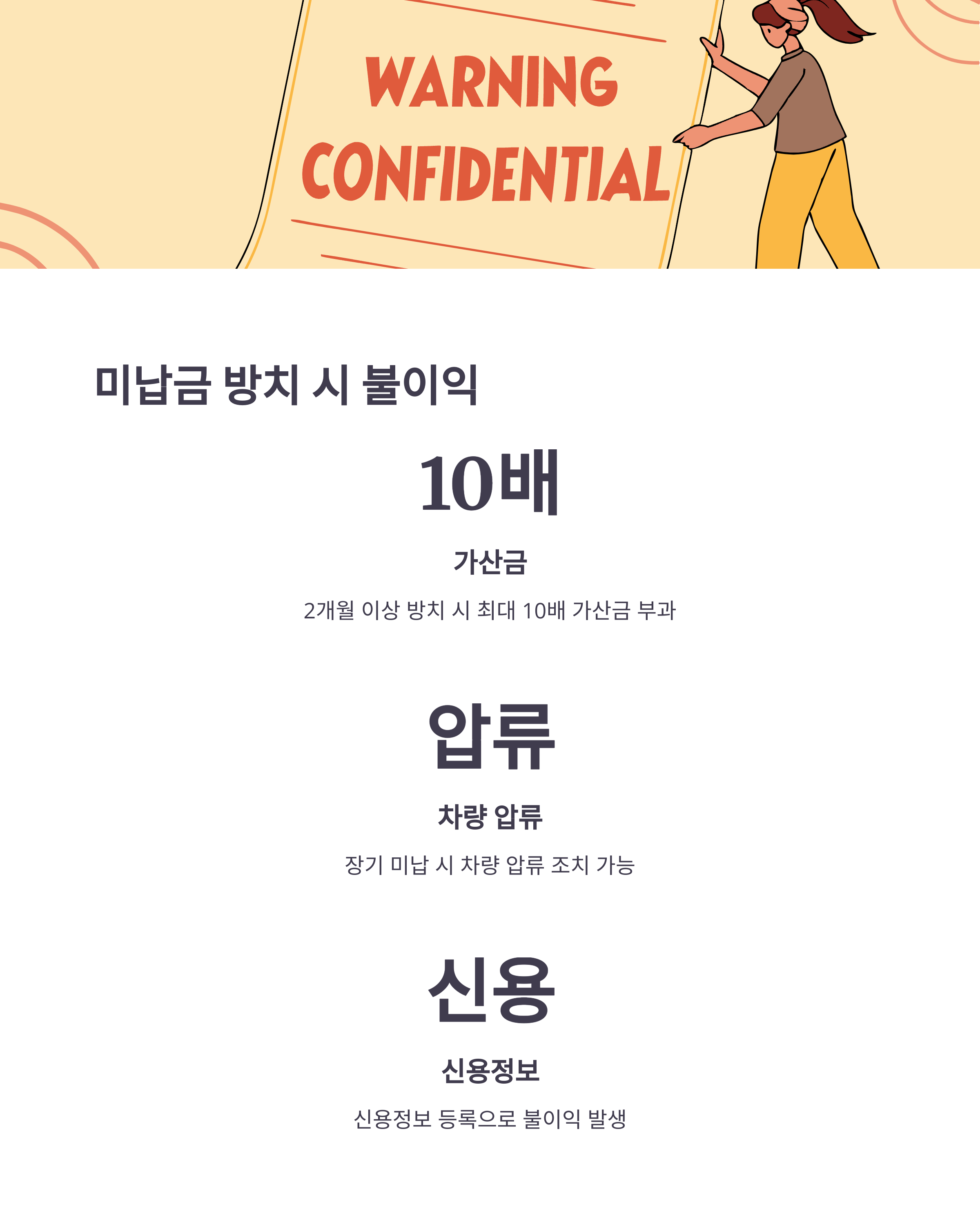 더 나아가 차량 압류 조치나 신용정보 등록으로 연결될 수 있어 즉시 조치가 필수입니다.