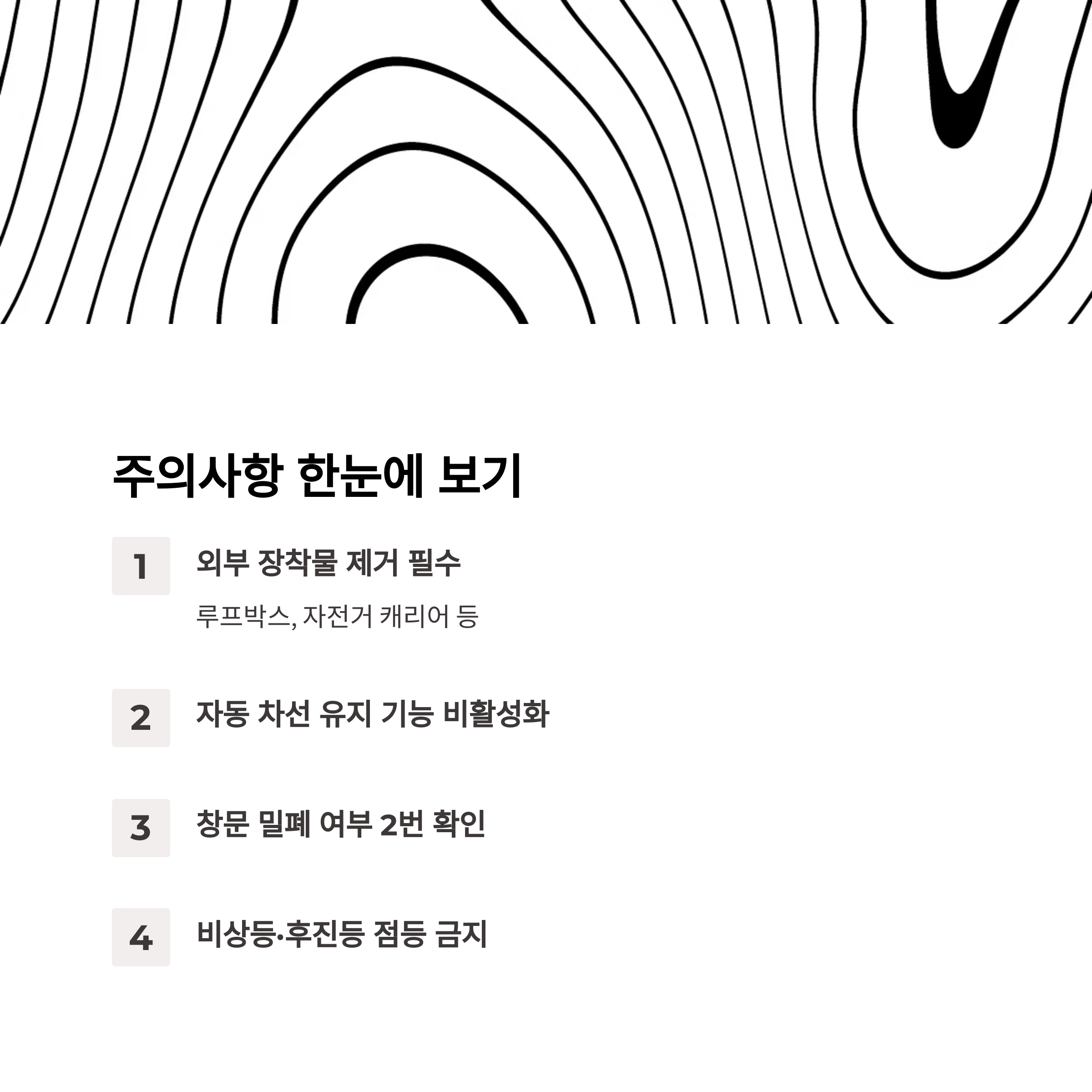 - 외부 장착물 제거 필수 (루프박스, 자전거 캐리어 등)