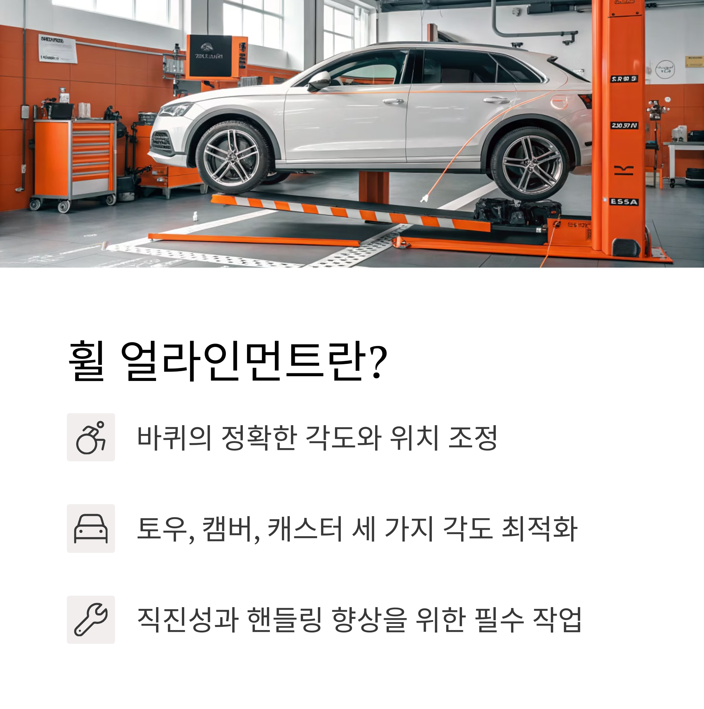 휠 얼라인먼트는 바퀴의 토우(Toe), 캠버(Camber), 캐스터(Caster) 세 가지 각도를 조정해 차량의 직진성과 핸들링을 최적화하는 작업입니다.