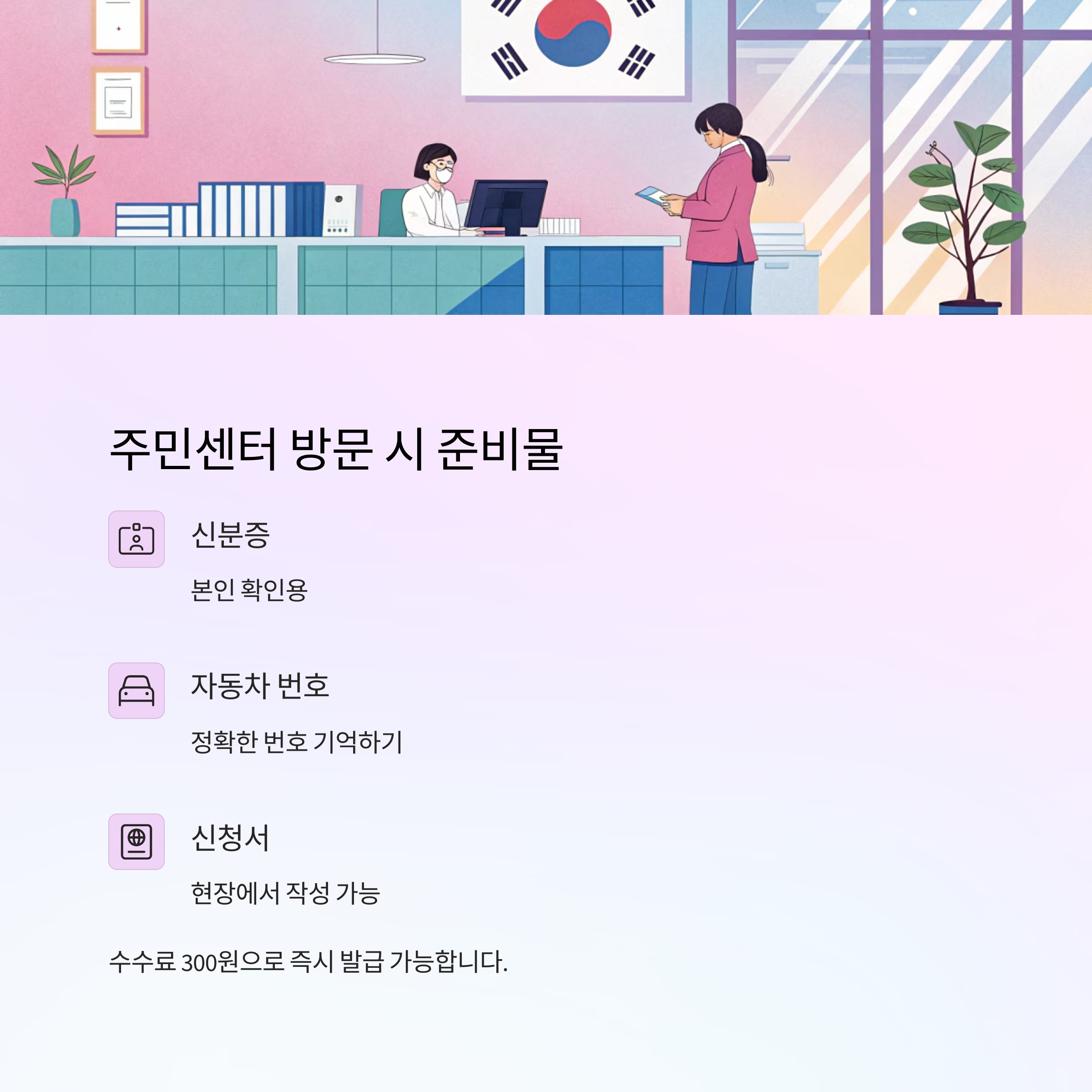 | 필요 서류 | 신분증, 자동차 번호, 신청서(현장 작성 가능) |