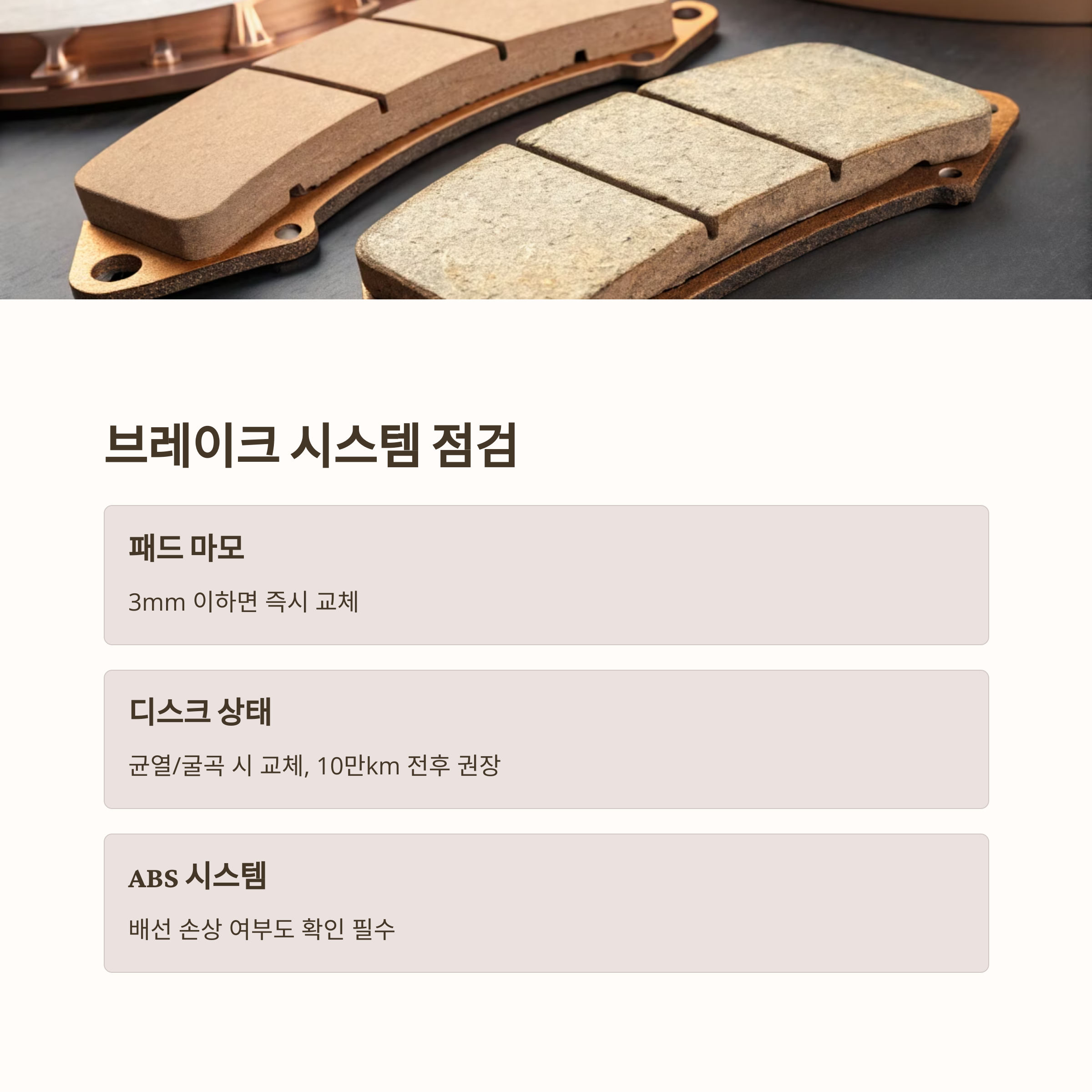 | 브레이크 패드 | 3mm 이하 | 즉시 교체 |