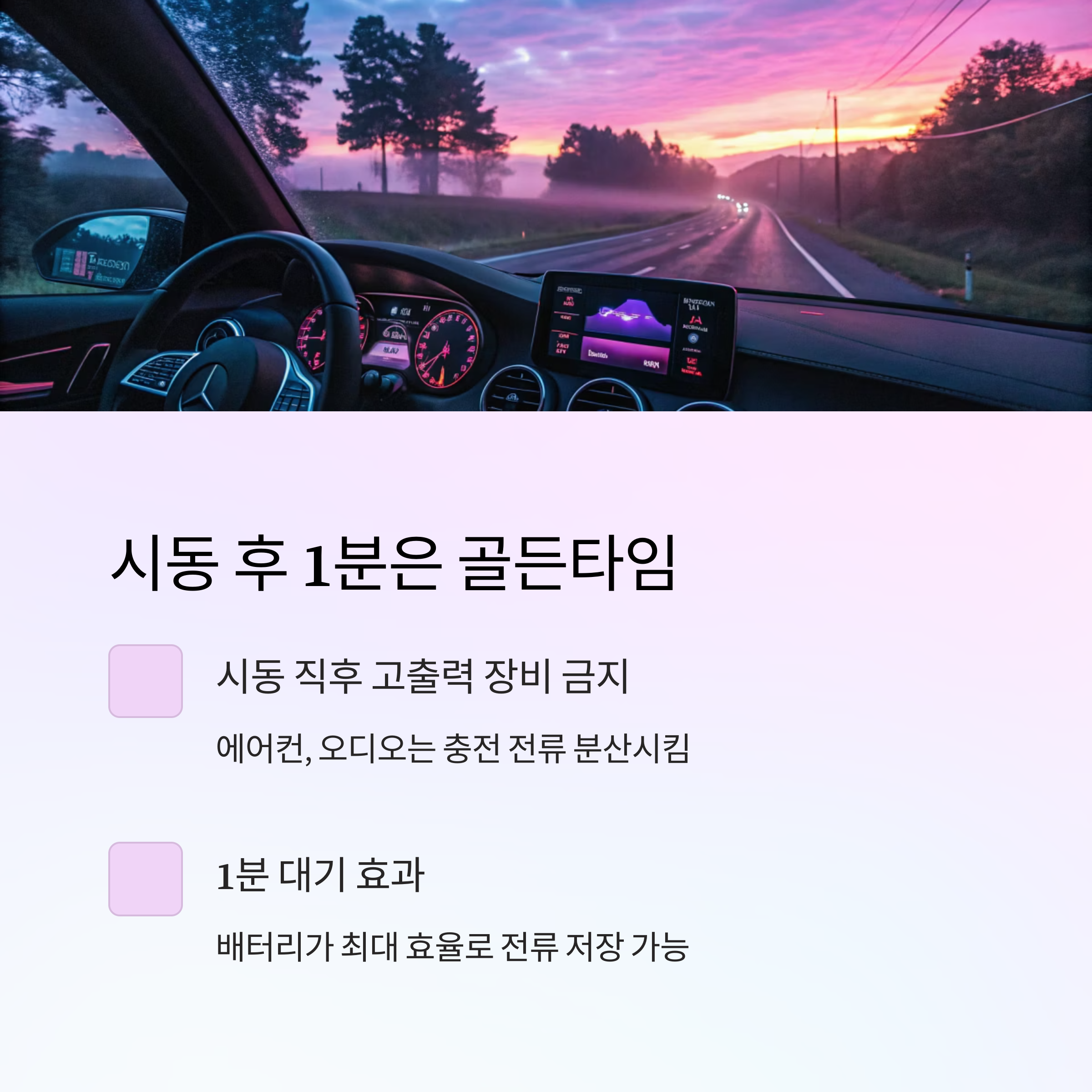 주행 후 바로 시동을 끄지 말고 1분 정도 공회전을 하며 충전을 마무리하는 습관이 필요합니다
